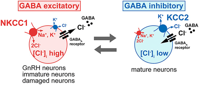 That chloride gradient is established by the relative proponderance of two cotransporters: the Na⁺–K⁺–2Cl⁻ cotransporter (NKCC1), which increases intracellular chloride, and the K⁺–Cl⁻ cotransporter (KCC2), which extrudes chloride from the cell. In most mature neurons, dominant KCC2 activity maintains low intracellular chloride levels, so GABA-A receptor activation allows chloride to enter the cell, leading to hyperpolarization and suppression of neuronal firing. GnRH neurons, however, exhibit comparatively higher NKCC1 activity and reduced KCC2 influence, resulting in elevated intracellular chloride concentrations (Watanabe et al., 2014).