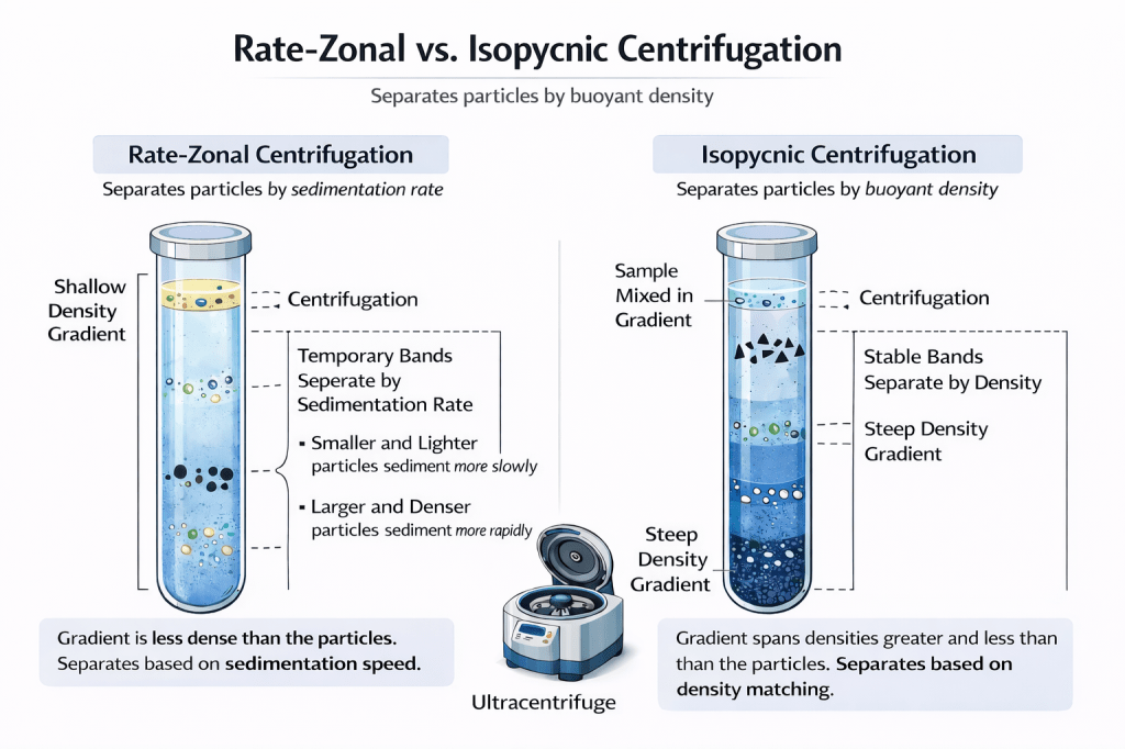 Figure 2. Conceptual comparison of rate-zonal and isopycnic density gradient centrifugation. This schematic contrasts two gradient-based centrifugation strategies used to separate biological particles. In rate-zonal centrifugation (left), particles are layered on top of a shallow density gradient that is less dense than the particles themselves. Separation occurs because particles migrate at different speeds under centrifugal force, forming temporary bands based on sedimentation rate. Larger and denser particles move more rapidly, while smaller and lighter particles lag behind, requiring centrifugation to be stopped before equilibrium is reached. In isopycnic centrifugation (right), particles are distributed within a steep density gradient that spans densities both greater and less than those of the particles. During centrifugation, each particle migrates until it reaches its isopycnic point, where its density matches that of the surrounding medium, forming stable, sharply defined bands that persist even with prolonged centrifugation.