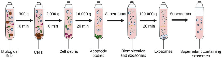 Figure 1. Sequential separation of particles from a complex biological fluid This schematic illustrates the sequential separation of particles from a complex biological fluid using increasing centrifugal force. An initial low-speed spin (~300 × g, 10 min) removes intact cells, followed by intermediate centrifugation (~2,000 × g, 10 min) to clear residual cell debris. A higher-speed spin (~16,000 × g, 20 min) pellets larger subcellular structures, including apoptotic bodies. The remaining supernatant contains soluble biomolecules and sEVs. Final ultracentrifugation at very high force (~100,000 × g, 120 min) sediments sEVs, commonly referred to as exosomes, leaving a clarified supernatant depleted of larger particulate material. This process concentrates nanoscale particles based on sedimentation behavior.(Image adapted from Dilsiz, 2024.)